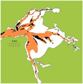 The article presents a simulation model of the tidal channels of a New Zealand harbor (pictured below) in which most of the sediment flow is ebb-tide dominant, while only a small fraction is flood-tide dominant. The brown color in the image indicates ebb-tide dominance, while the black indicates flood-tide dominance. White areas are intertidal sandbanks. The model shows that there was net seaward transport almost everywhere except in the short side arms of main channels.
